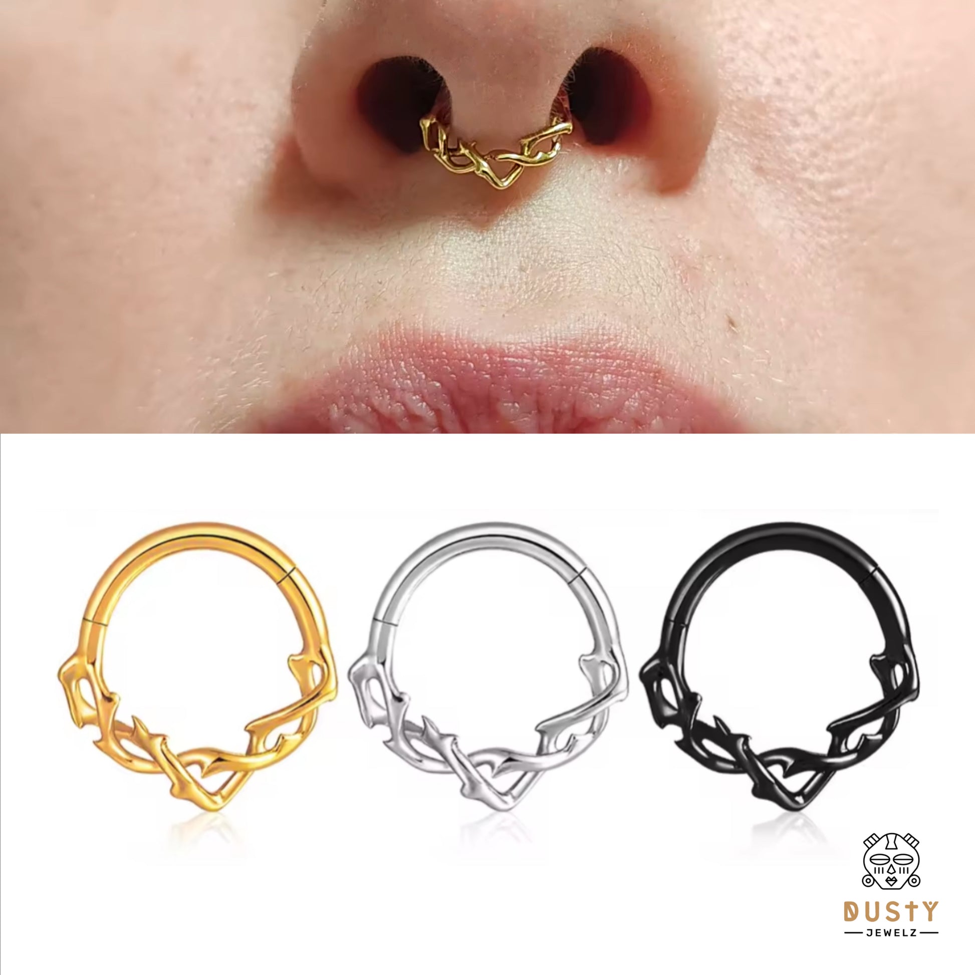 Add a touch of edge to your look with the Vine Hinged Septum Ring. Crafted from durable stainless steel, this clicker features a unique wreath and barbed bough design that tapers into a V-point, creating a crown of thorns when worn on your septum or daith. Available in silver, gold, or black and in 1.2mm size with an 8mm drop. Elevate your style with this statement piece!