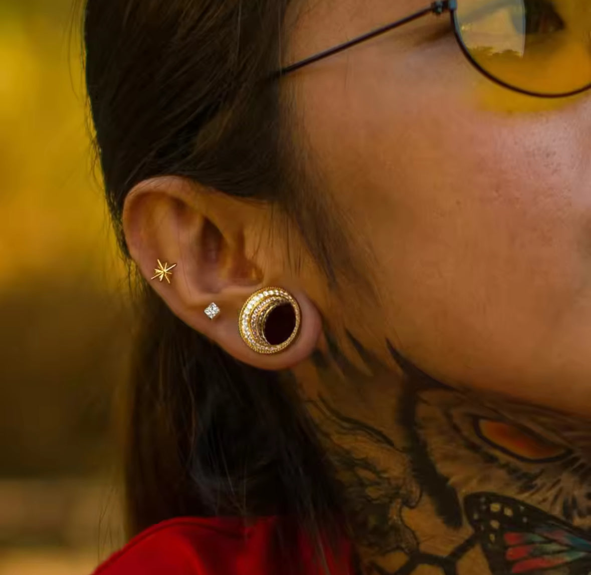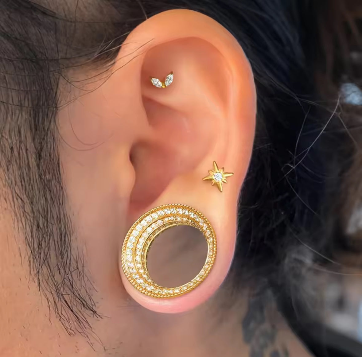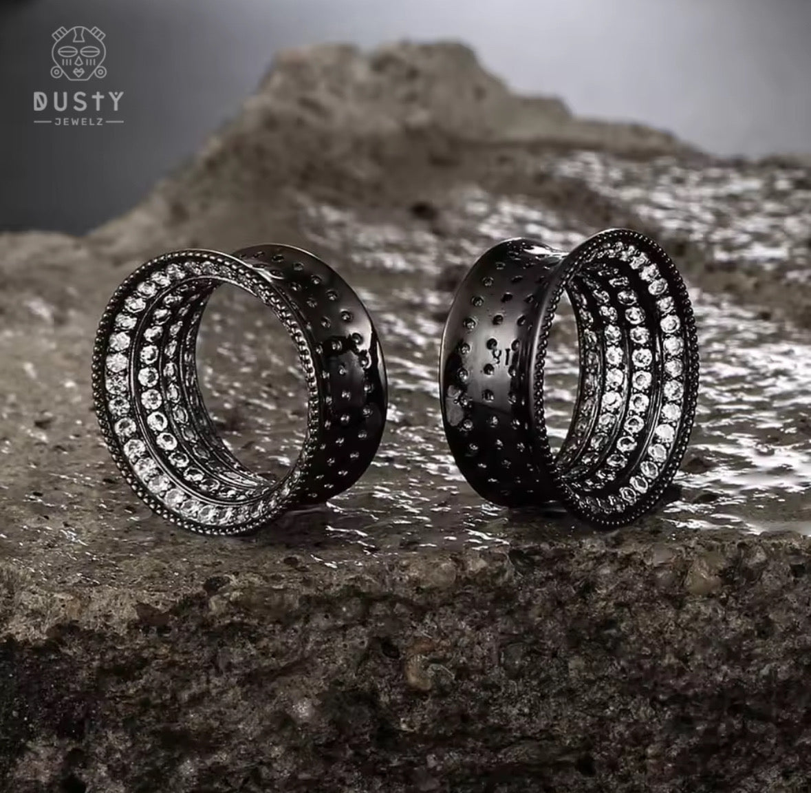 Step up your style game with our Crystal Paved Flared Stainless Steel Tunnels! Featuring a sleek circular design adorned with glimmering crystals, these tunnels sparkle with every move. Their expertly detailed outer and inner rims create a stunning layered effect, giving you an effortlessly chic and luxe look.