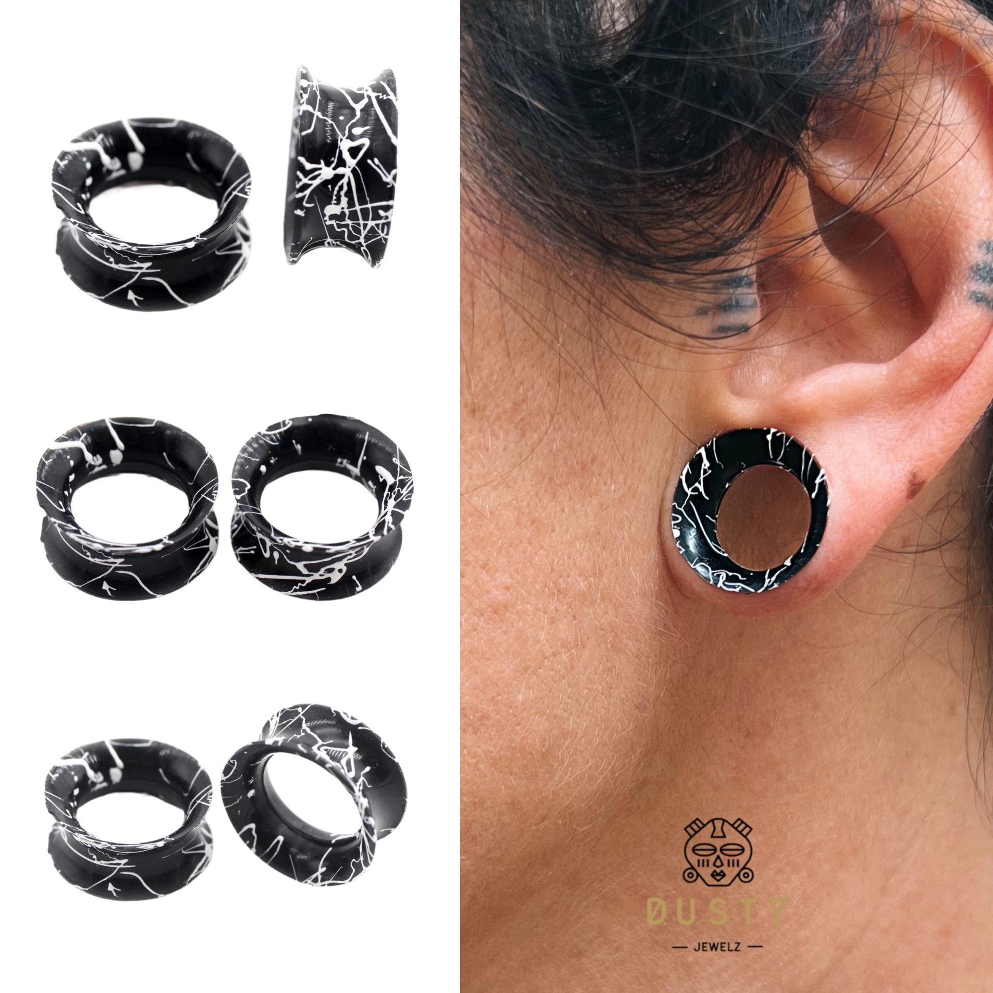 Silicone Ear Skins | Double Flare Tunnels | Splatter Paint | BLACK & WHITE