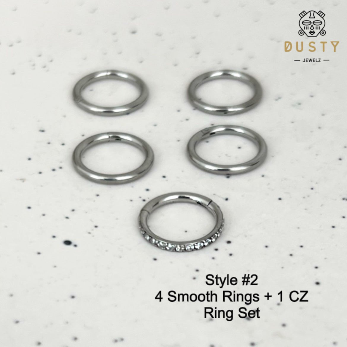 Price is for one set of 5 (individual) hinged clicker rings, intended to be stacked in a stretched ear lobe. All rings are 16g in thickness, and 2 inner diameter options - 8mm or 10mm.