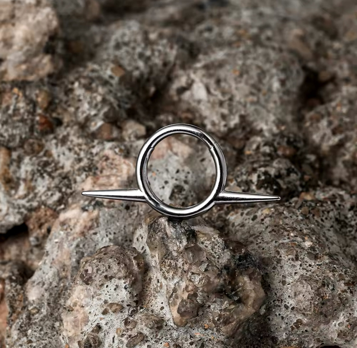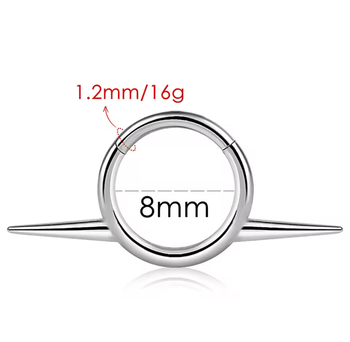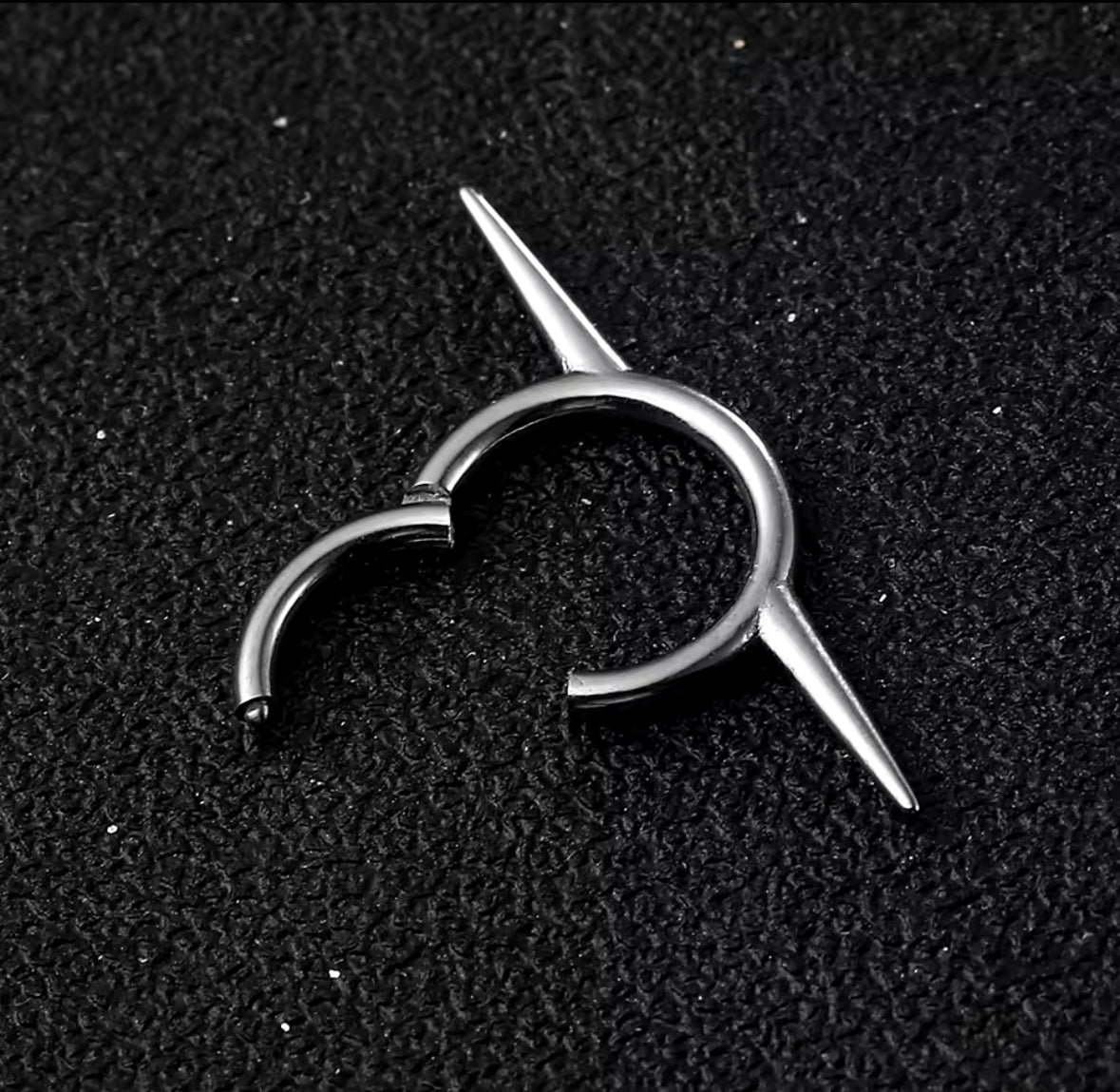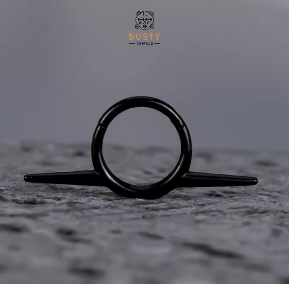 Experience edgy and effortless style with our Long Spike Hinged Septum Ring. Made from Titanium, this clicker features a horizontal long spike design that adds a bold and unique touch to any conch, septum, or cartilage piercing.